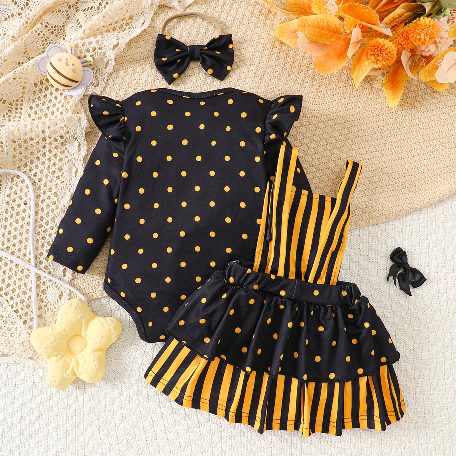 Dress your little one in sweet buzzing style with this Baby Girl Bee Halloween Costume Set 🐝✨. Designed for newborns and toddlers, this 2-piece outfit includes a long flying-sleeve romper paired with a tulle suspender dress, giving your baby girl a charming and festive look.